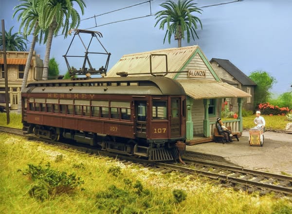 US Interurban layout, as an excuse to run pairs of pantograph equipped General Electric Steeplecabs and multiple Interurban cars under catenary. 3D printed passenger