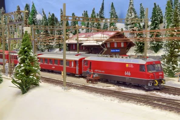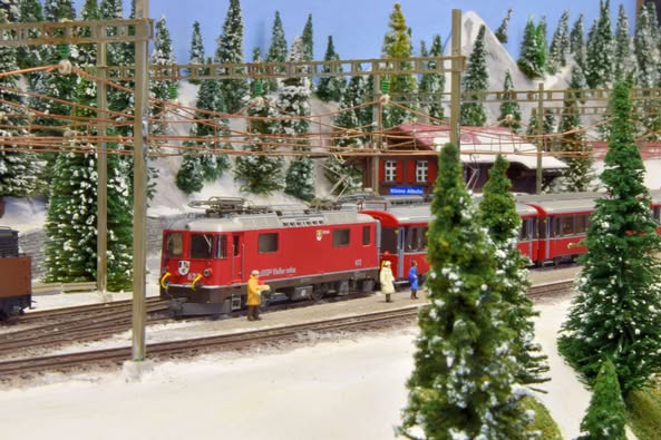 of the Rhätische Bahn (RhB), in South-Eastern Switzerland. The layout is set towards the end of winter depicting clear roads and tracks but with plenty of snow