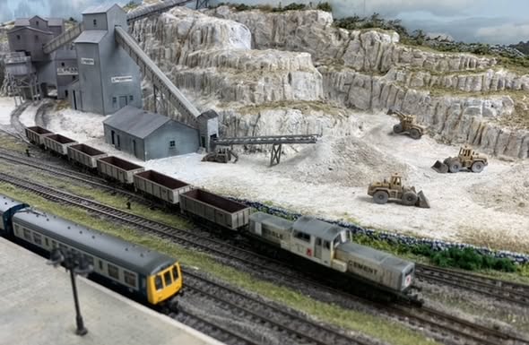 but it was once part of the ICI Buxton lime operations. The layout is a "what might have been": features of the layout are a three platform station, the quarry, a