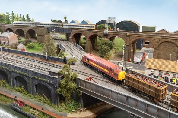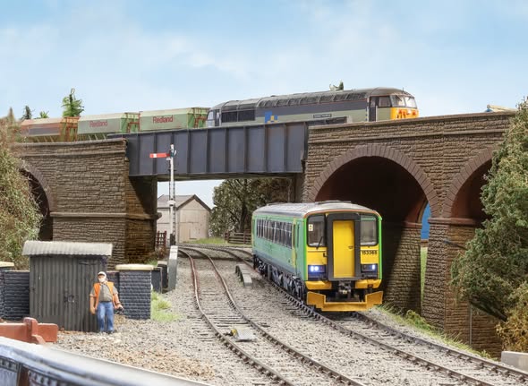 an ex-GCR line on the lower level. One throat of the station is modelled together with the station buildings and surrounding town scene. The River Acres